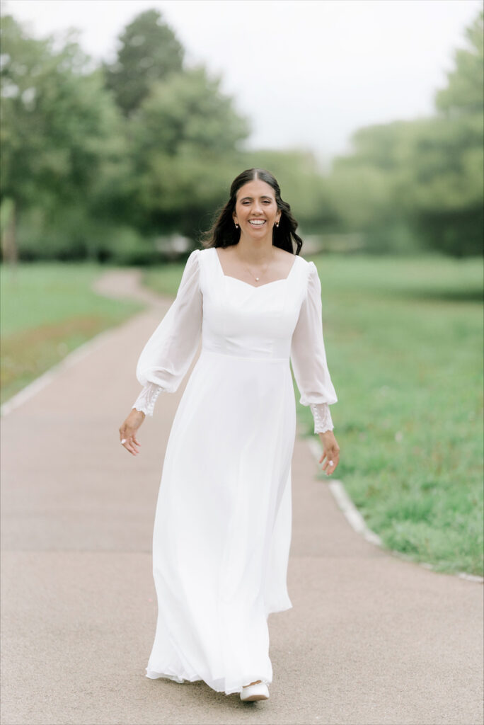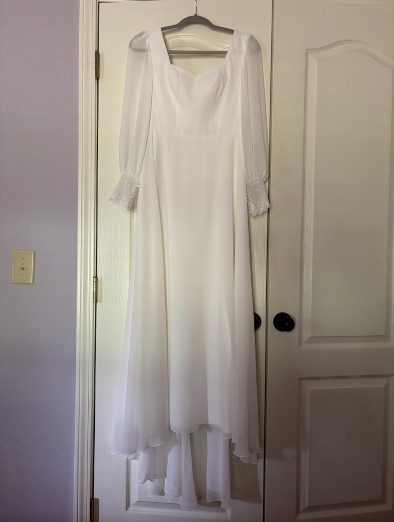 Not only did the team keep me posted on where my dress was at in production, it came with plenty of time to spare and fit almost perfectly! It required the most minor of alterations to fit the way I wanted and I was so thrilled with the end result. I added flutter sleeves, buttons all the way up the back, a closed skirt (no slit), and a chapel length train and I was stunned with how it came out! The quality was incredible, the crepe fabric was so soft, lightweight, and comfortable compared to every other dress I tried on.