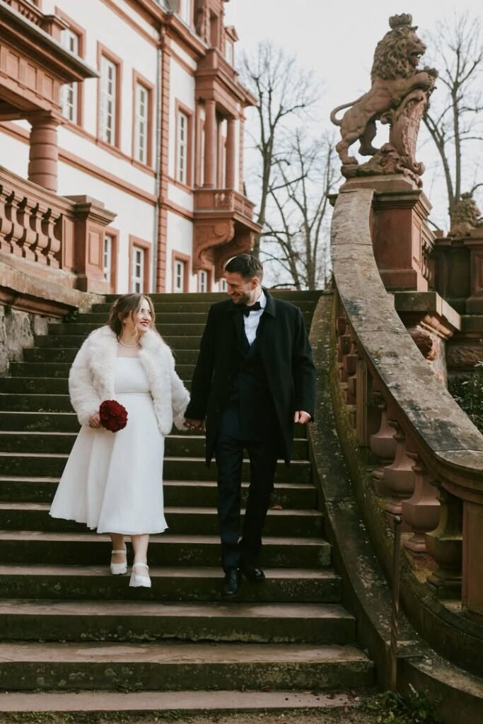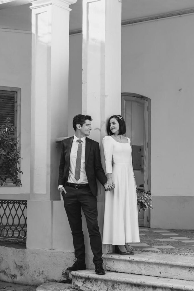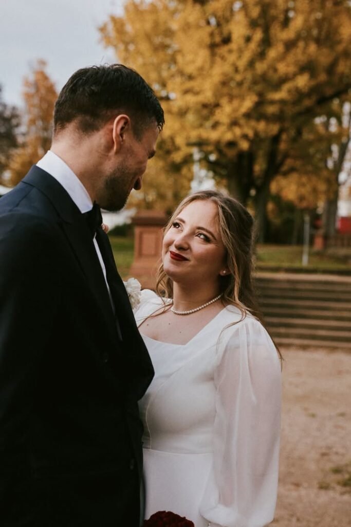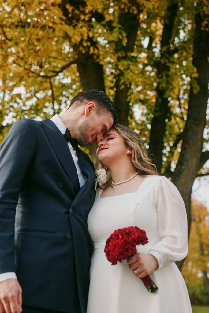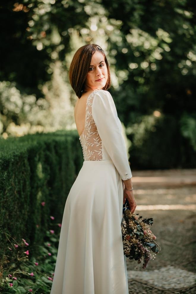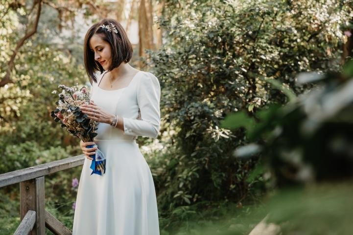 Working with Aleksandra was great. The dress was beautiful and fit perfectly (ordered made to measure). It was also perfect for the vibe of our wedding. I never tried on a single wedding dress before ordering, and I don’t regret it! Aleksandra was even able to switch the neckline shape per my request. The dress did come longer than requested, I think so I had it hemmed, which was a bit expensive. But better too long than too short! Also the wrist opening dimension I gave was too tight. The alterations woman at the local dry cleaner was able to add some longer loops for the buttons and it was perfect! I need to lift my arms above my head!