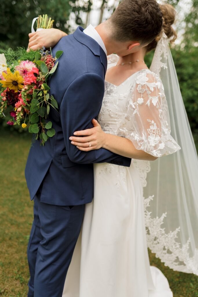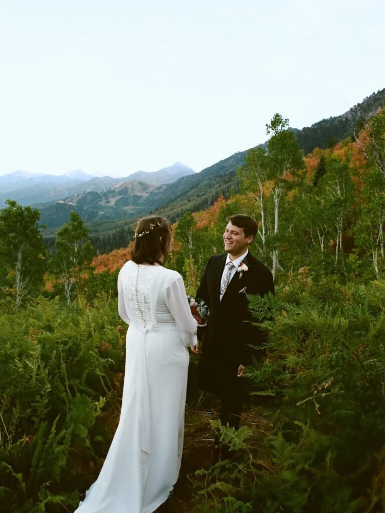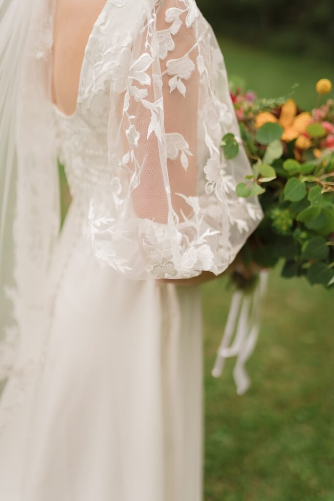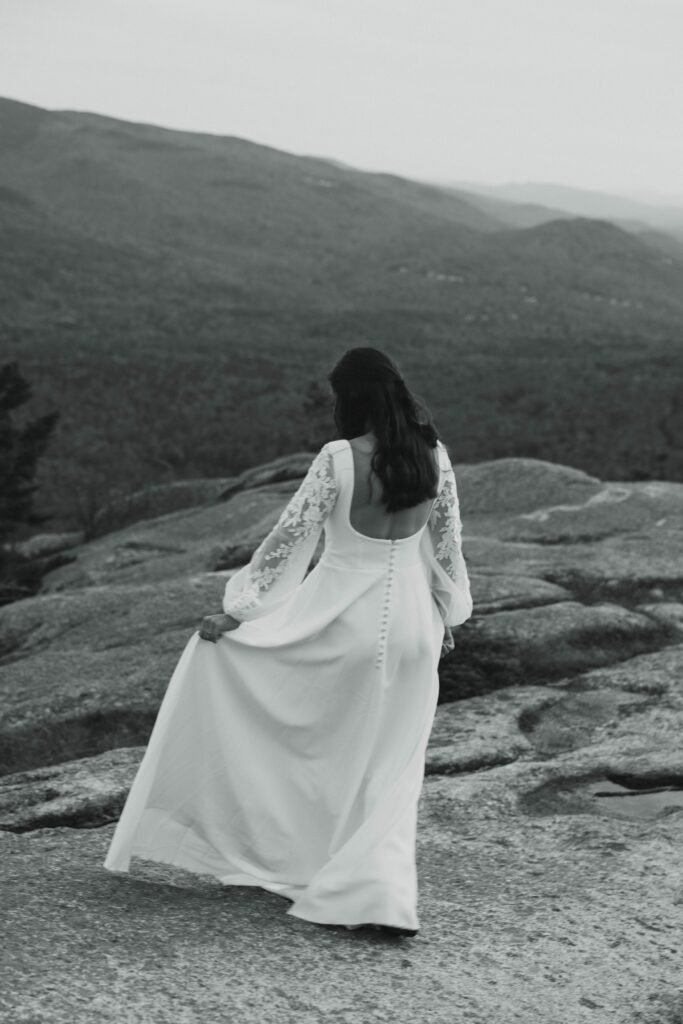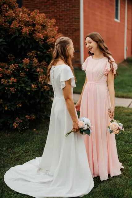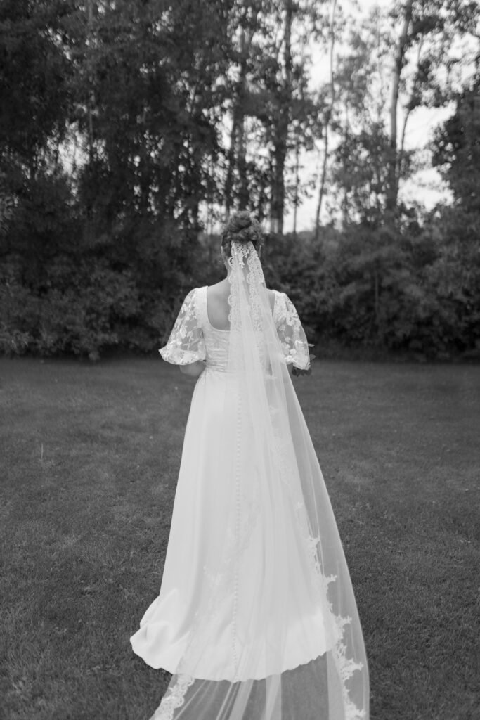 Not only did the team keep me posted on where my dress was at in production, it came with plenty of time to spare and fit almost perfectly! It required the most minor of alterations to fit the way I wanted and I was so thrilled with the end result. I added flutter sleeves, buttons all the way up the back, a closed skirt (no slit), and a chapel length train and I was stunned with how it came out! The quality was incredible, the crepe fabric was so soft, lightweight, and comfortable compared to every other dress I tried on.