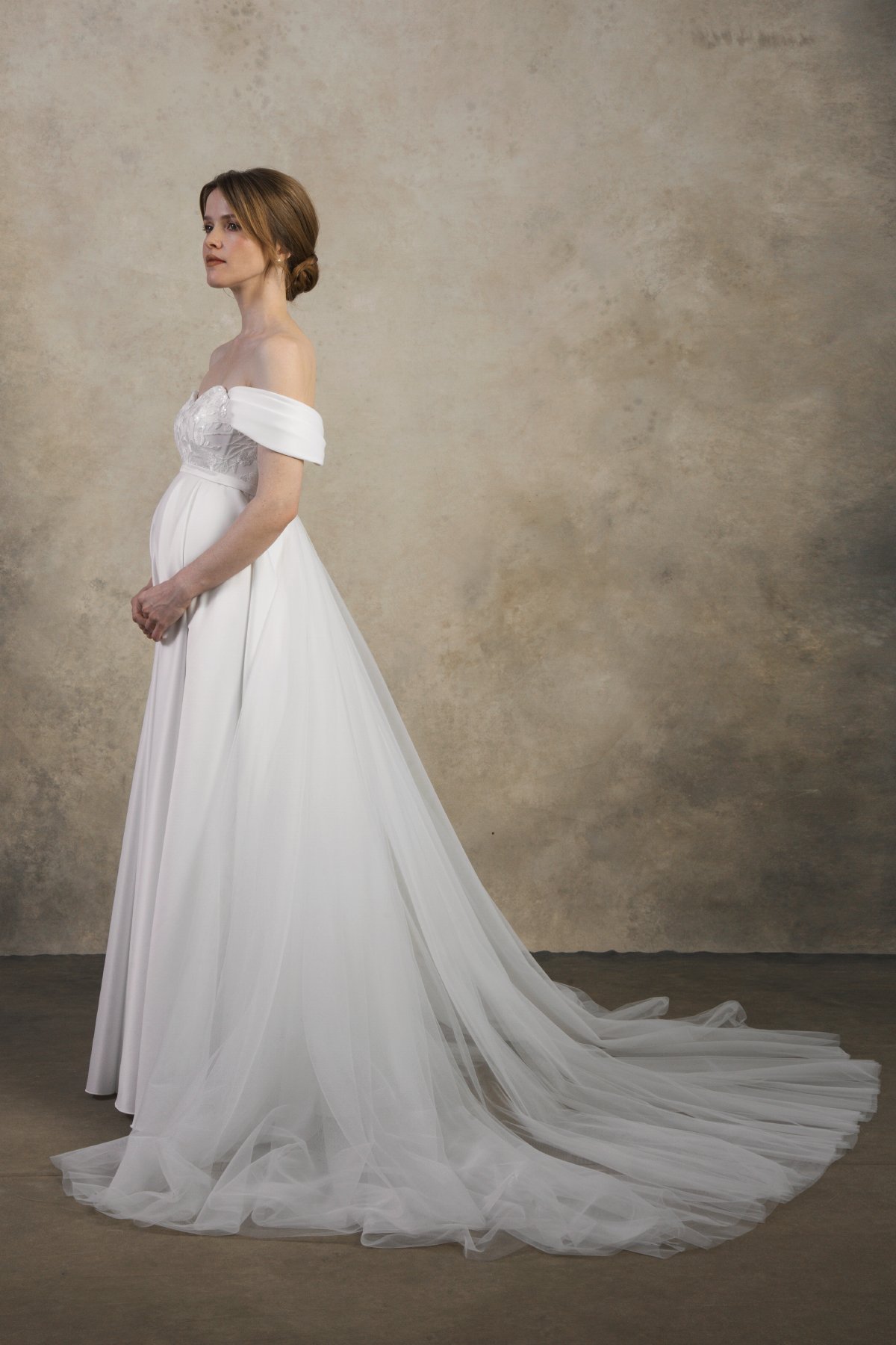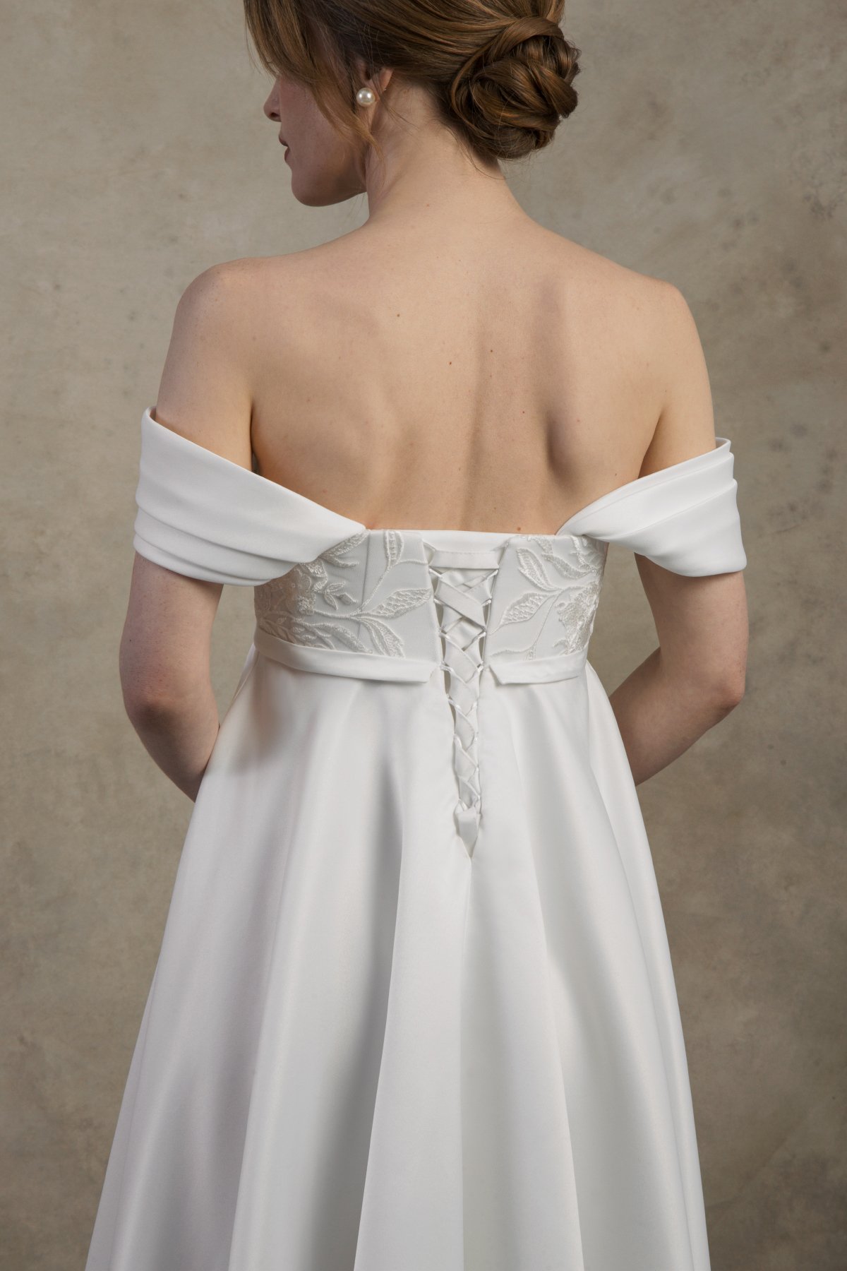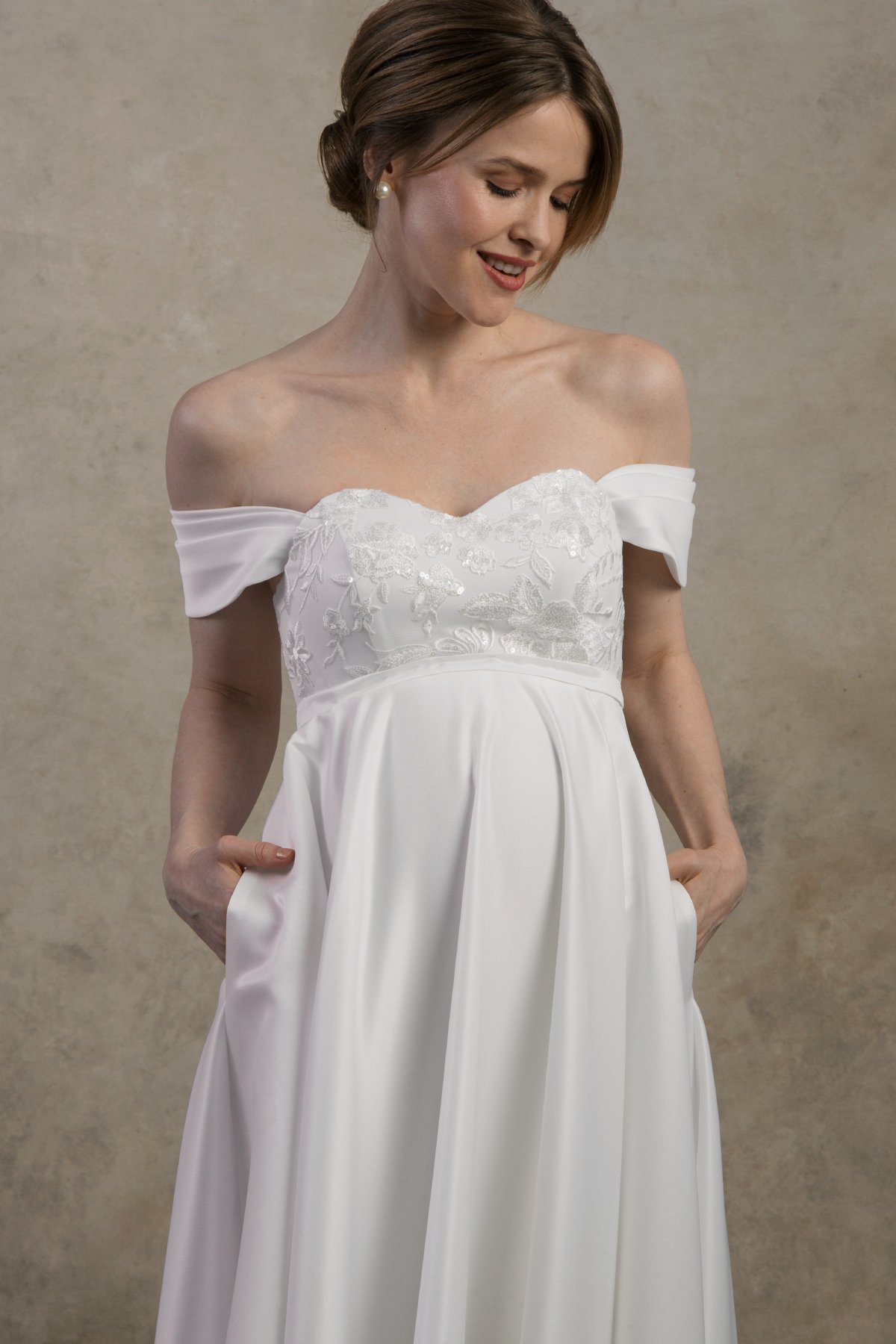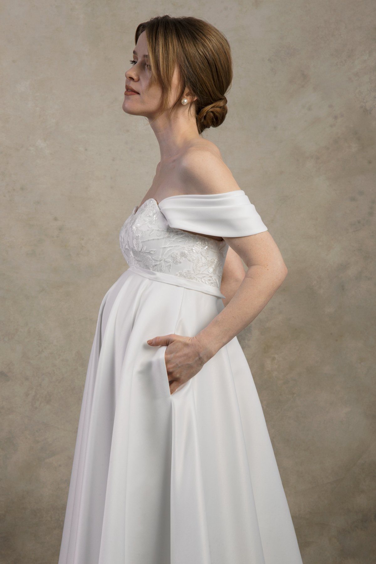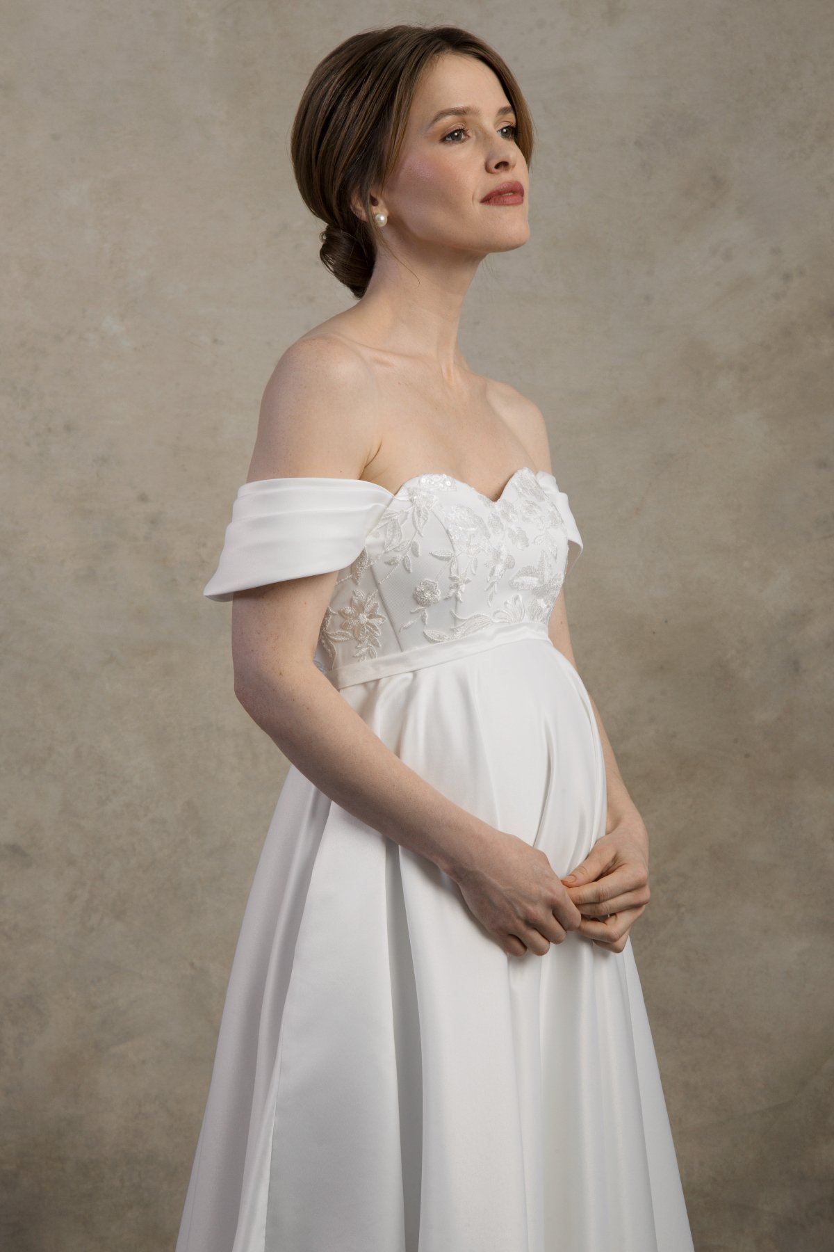 The Felicia dress is a romantic off-the-shoulder maternity wedding gown crafted from soft satin that drapes beautifully over the growing belly. With an elegant A-line silhouette and adjustable inner lacing for secure support, it offers timeless grace and effortless comfort for expecting brides.