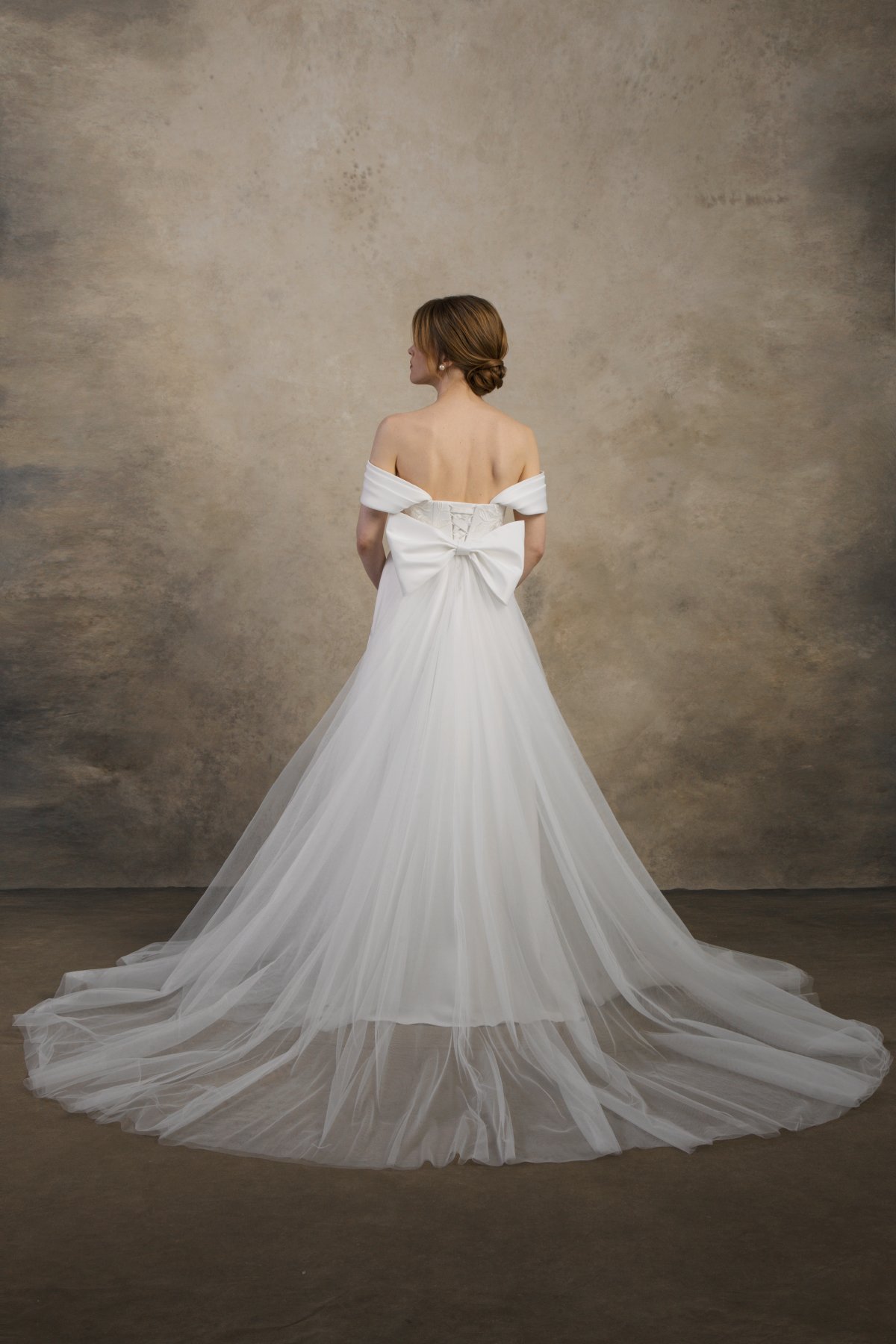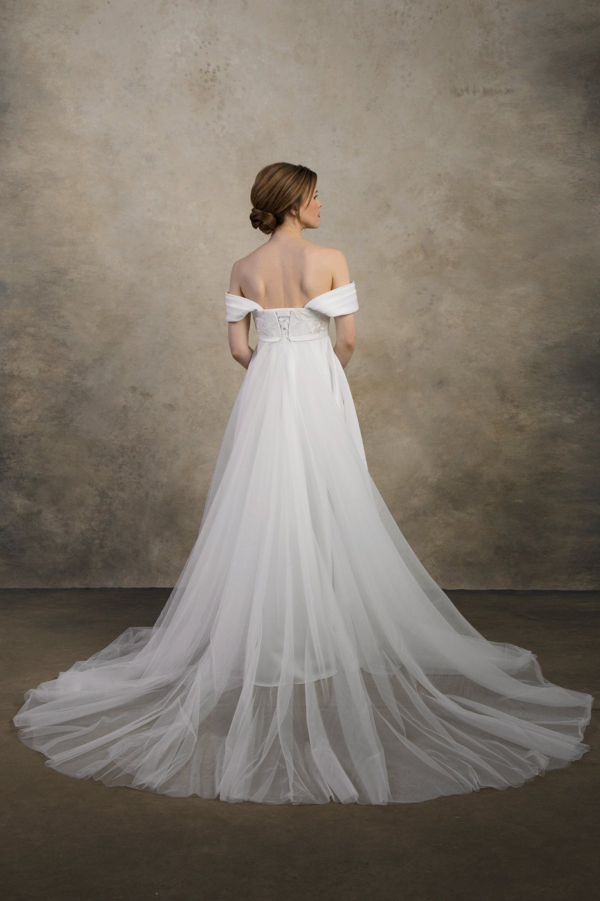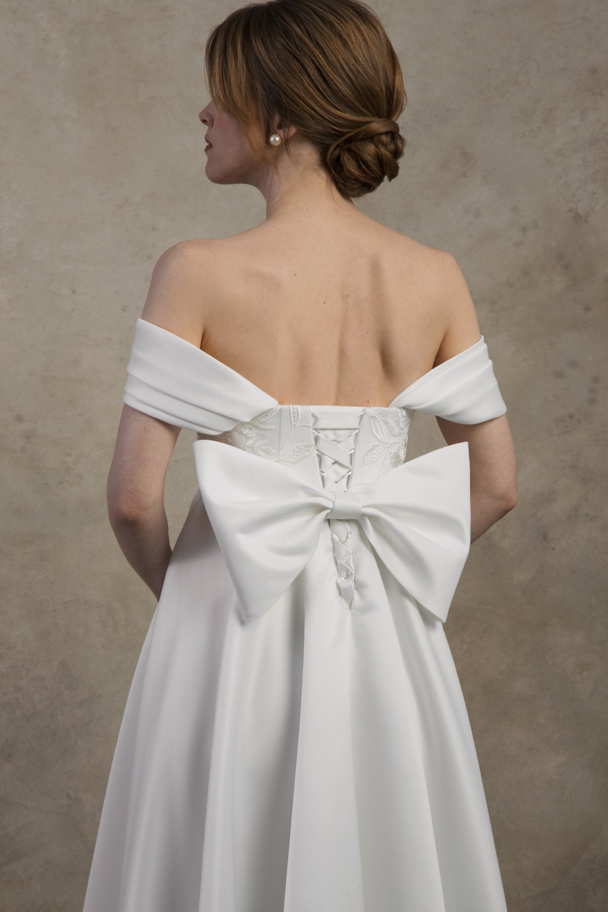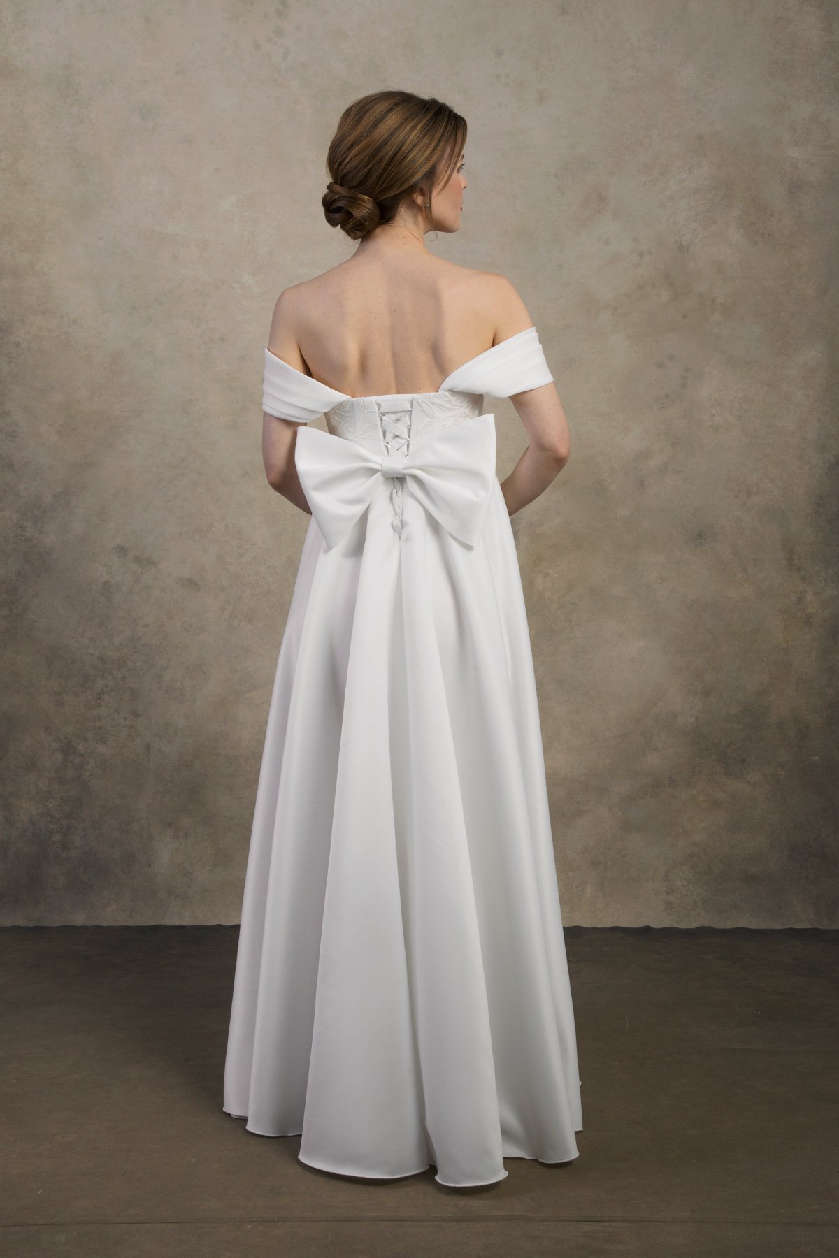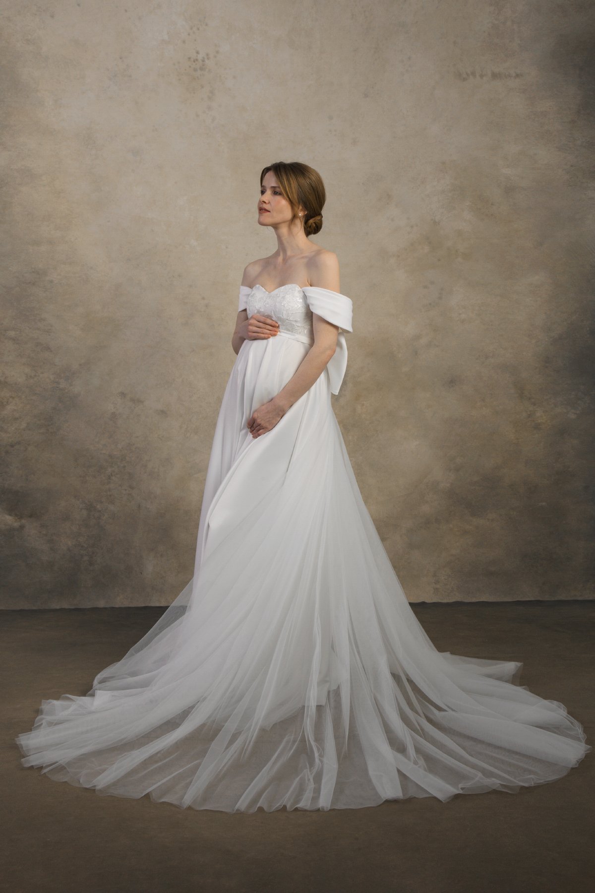 The Felicia dress is a romantic off-the-shoulder maternity wedding gown crafted from soft satin that drapes beautifully over the growing belly. With an elegant A-line silhouette and adjustable inner lacing for secure support, it offers timeless grace and effortless comfort for expecting brides.