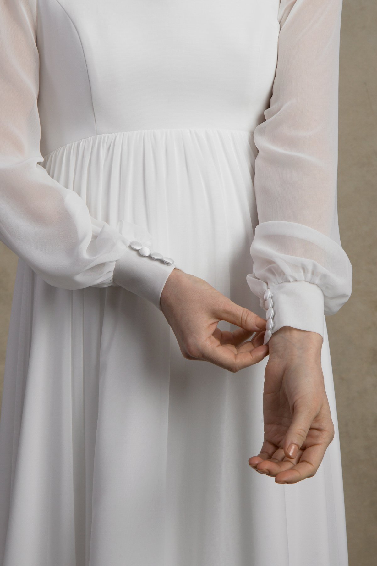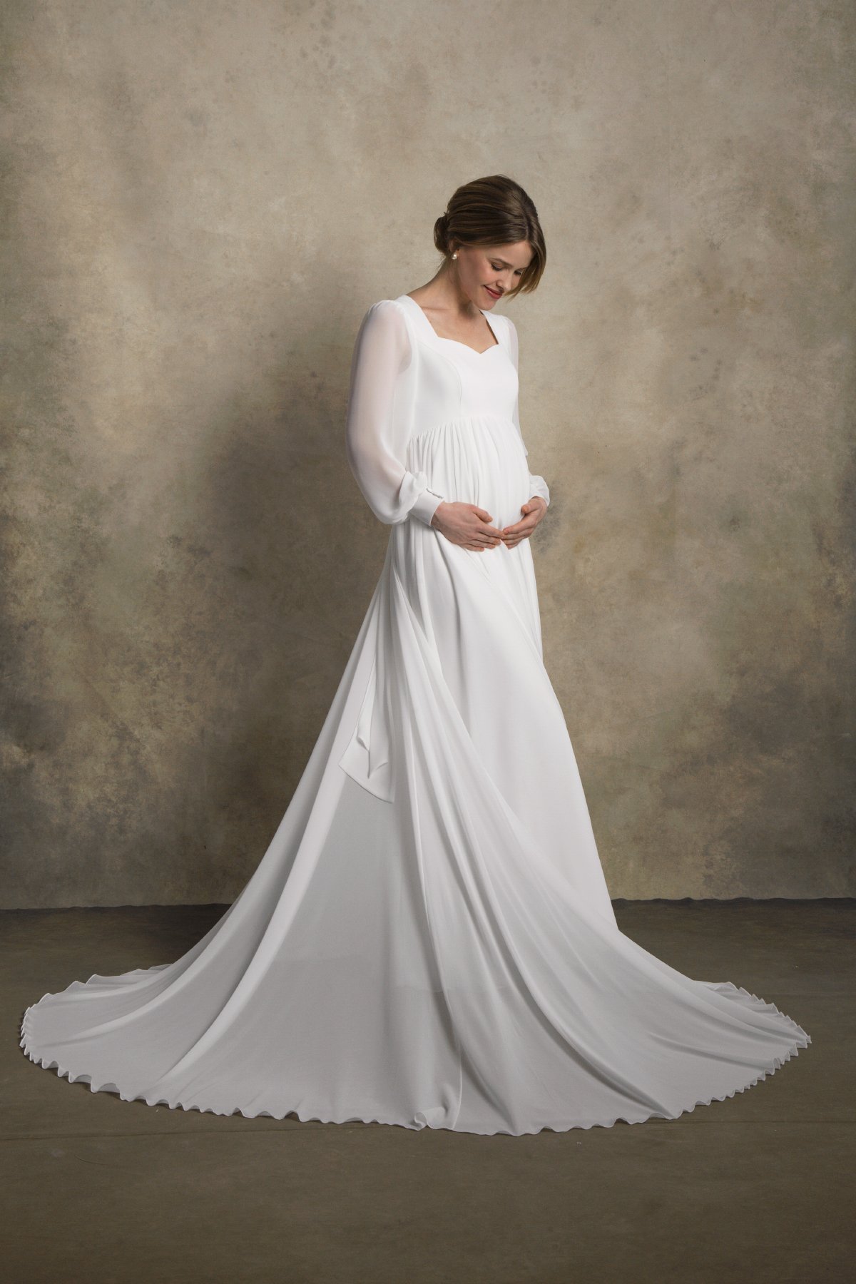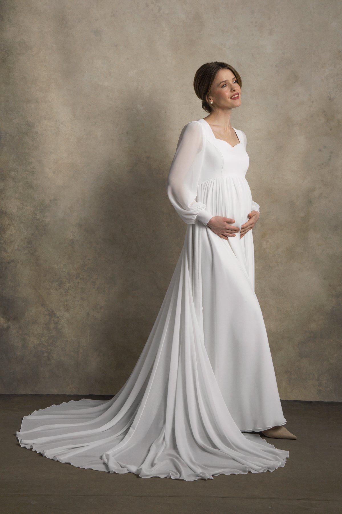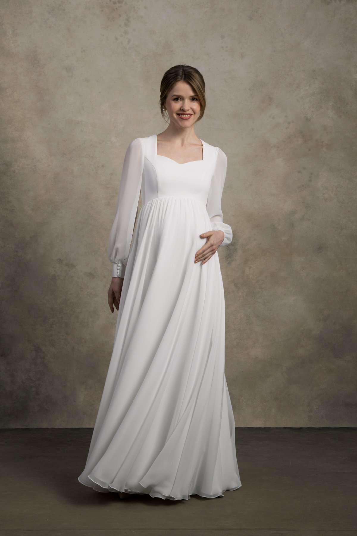 The Madison maternity wedding dress is a soft chiffon gown with an elegant empire waist, long sheer sleeves, and a beautifully embroidered back. Light, comfortable, and timeless, it drapes gently over the bump and creates a graceful, effortless silhouette. A perfect choice for modern expectant brides looking for a simple, refined, and romantic wedding dress.