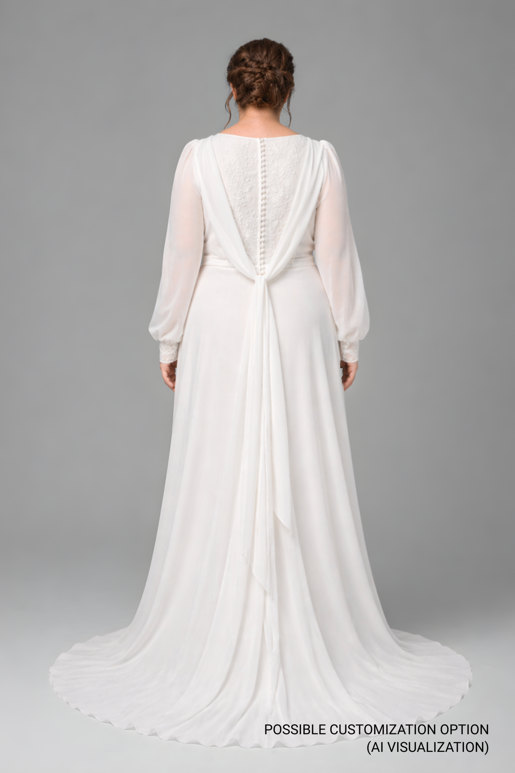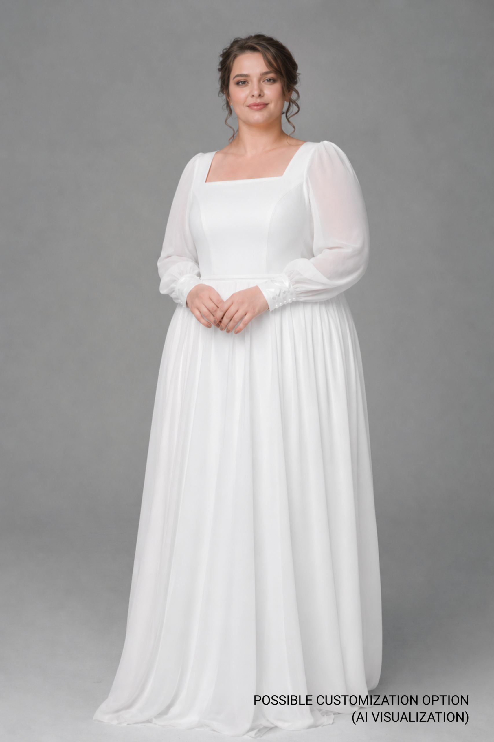 The Caitlin dress is a modest square-neck wedding gown with long sheer sleeves, a soft A-line silhouette, and an embroidered back for a touch of romance. Elegant and lightweight, it’s perfect for brides seeking timeless simplicity and comfort for any season.